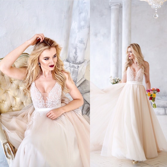 Wedding Gown 2019 Peach Wedding Dress Boho Dress Nude Bridal Gown Beach Wedding Dress Lace Wedding Gowm Berta Style Wedding