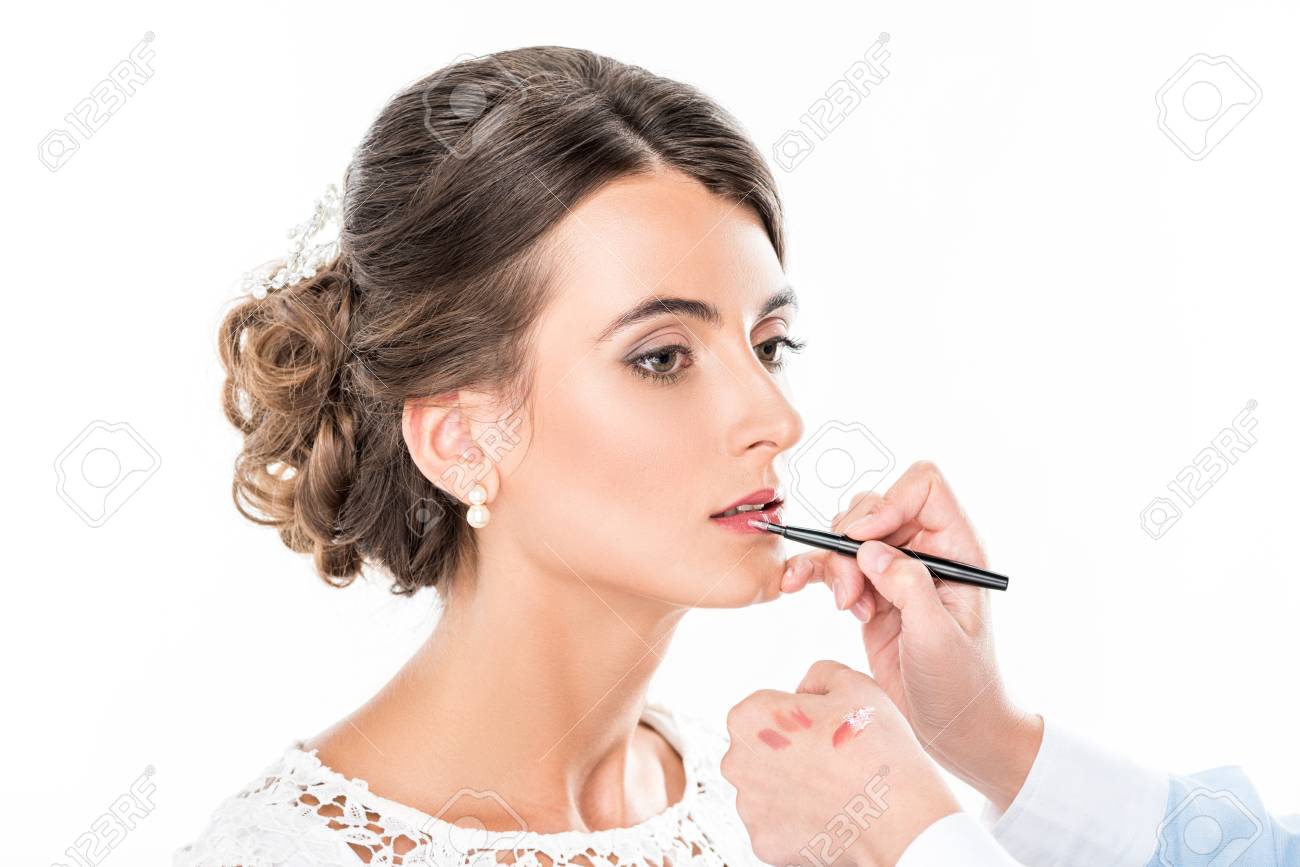 Side View Of Makeup Artist Applying Lipstick On Models Lips Using