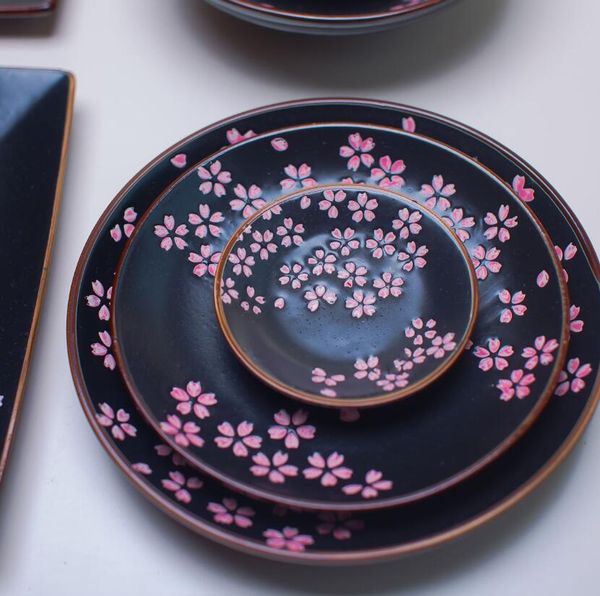 Sushi Set Red Cherry Blossom On Speckled Black With Round Plates